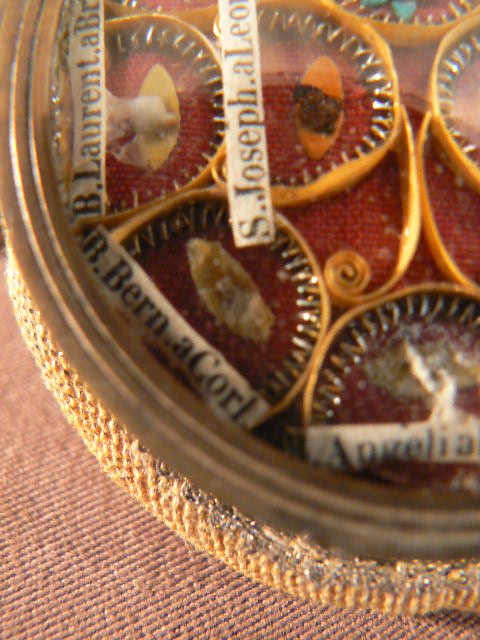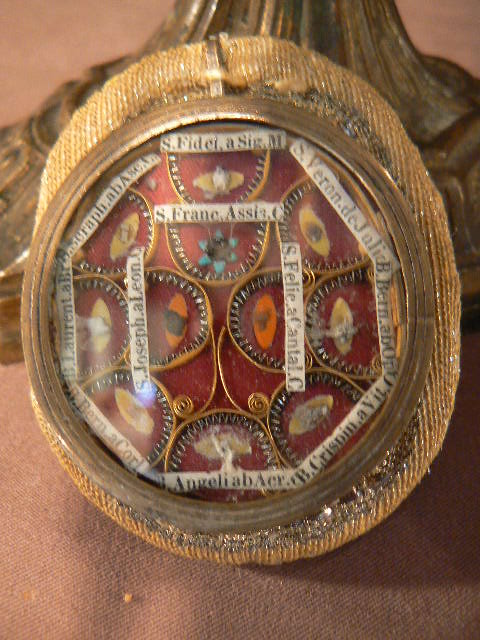 Reliquary Bronze Mutl Relics& Authentique 1858.Réf-N°7Superb altar reliquary solide bronze, with mult relics, and document authentique . Sizes, H 15.5 inch. Oval reliquary 2.5 x 2 inch. Circa 19 thC French. Inside, mult relics. Ex Pallio St Franc Assi.c. Ex oss St Fidel.a sig.M. St Veronica de julienis. St Laurent.aBr. B.Bern a Corl. St Joseph a Leon.C. St Felic.a Cantal.C. B Crispin. a Vit C. B Bern a Corl. St Seraph.ab.As C. B.Angeli ab Aer.C. Authentique.Dated 1858. The wax seal and threads broken and all in place. Perfect condition. Please feel free to browse this item's pictures.